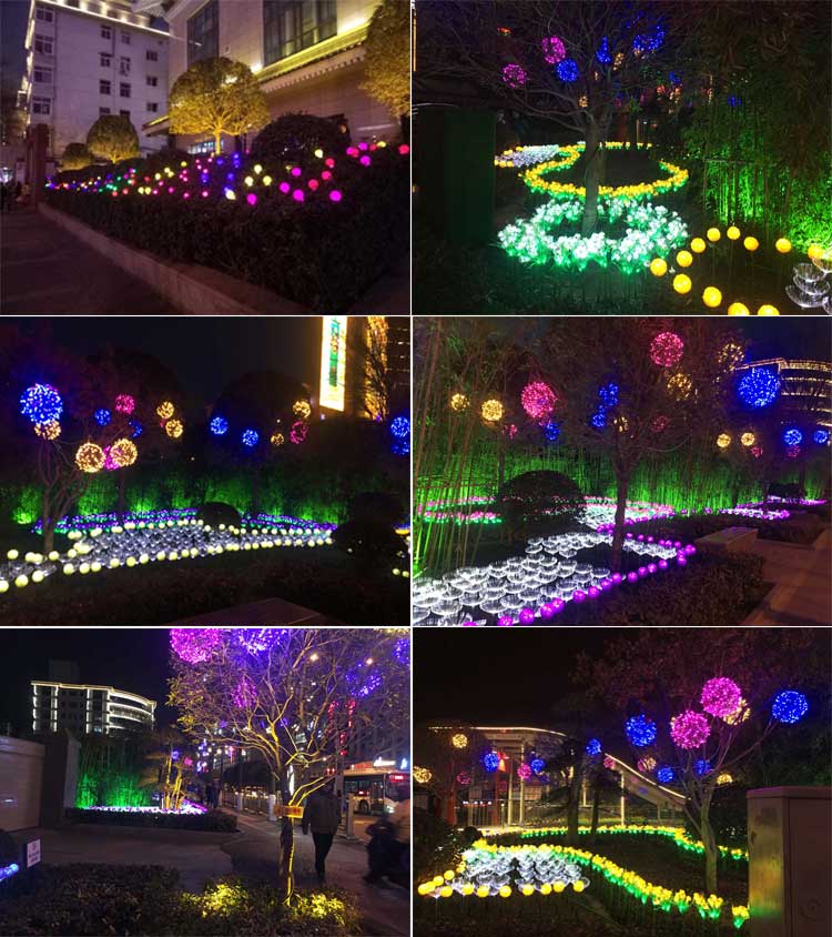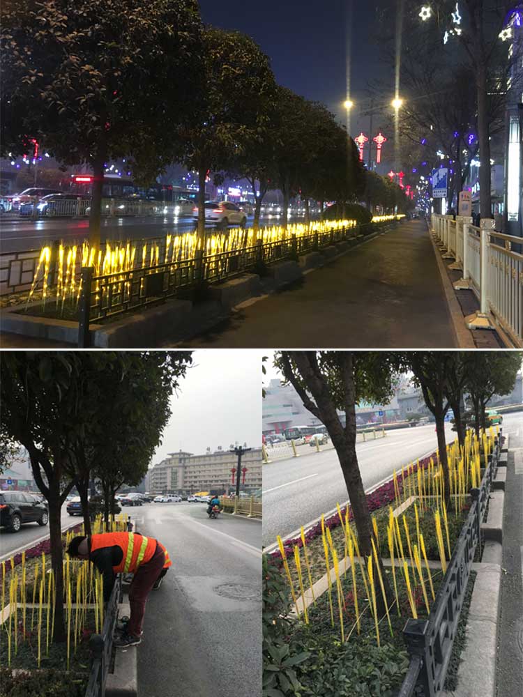 西安蓮湖區2019年元旦、春節亮化工程。項目包括鐘鼓樓燈光花籃雕塑,郵政廣場亮化、北大街主干道的亮化。采用了麥穗插地燈、郁金香插地燈、芙蓉花插地燈、小品燈球、串燈等多款造型燈具,共同打造出北大街沿線的夜景風光。