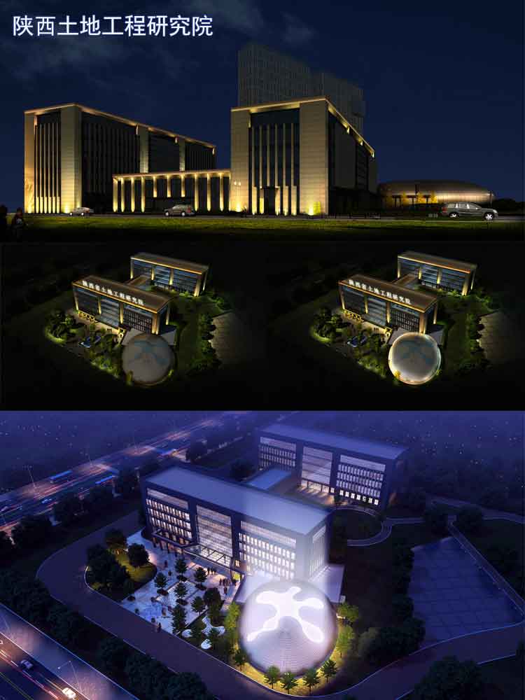 簡介—— 陜西土地工程研究院是承擔各類建設(shè)工程勘察、設(shè)計、土建、安裝、市政、石化、公路、地鐵、機場、礦山、核電、裝飾、鋼結(jié)構(gòu)、古建園林工程施工。對于設(shè)計院辦公樓體亮化設(shè)計,公司設(shè)計師跟根其前后樓體的建筑和廣場的球狀建筑的特點,采用簡單的洗墻燈和投光燈來進行效果設(shè)計,彰顯建筑的大氣與威嚴。