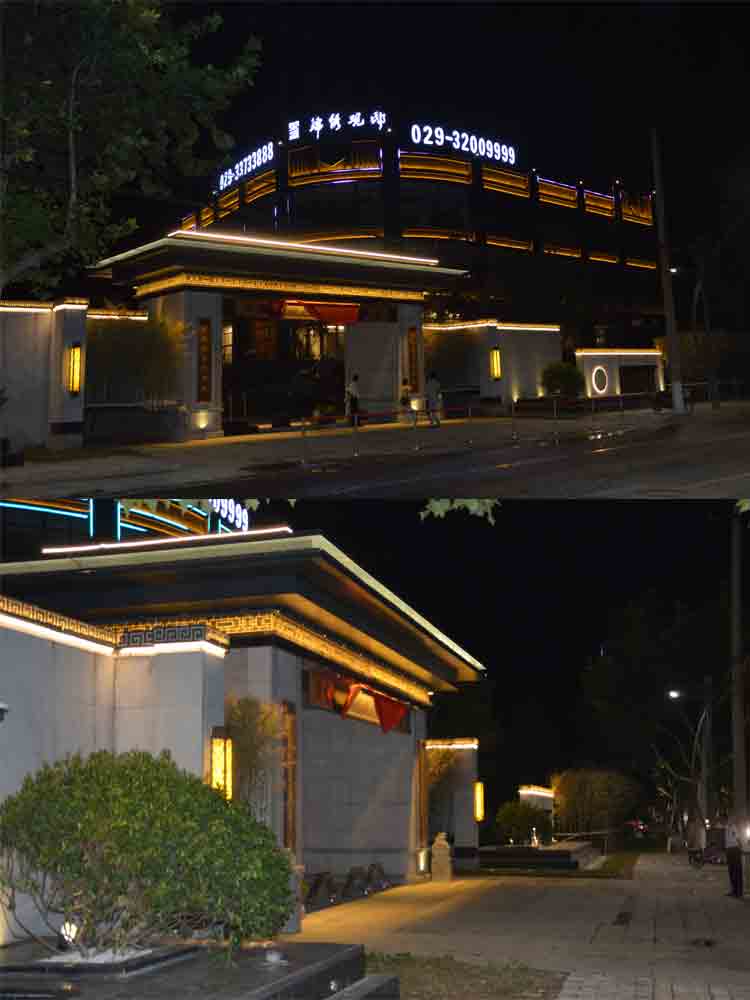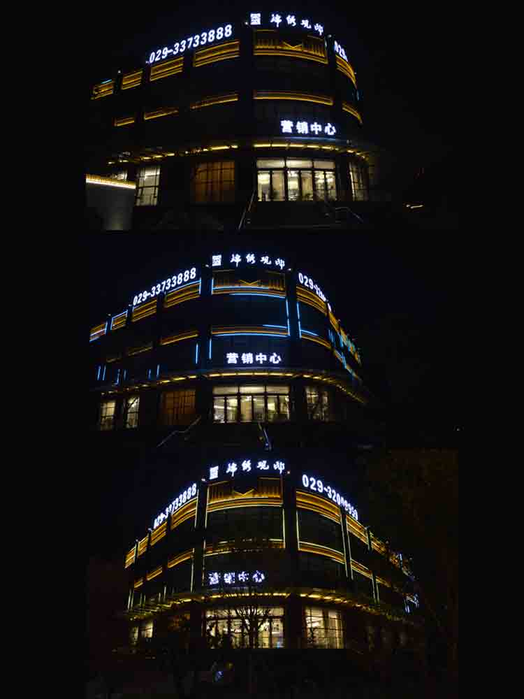 西安金宇藍苑,地理位置優越,我公司亮化設計師著重于該建筑物夜晚的美觀效果。從周圍景觀,樓宇本身的造型及商業部分的用途,外…